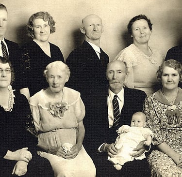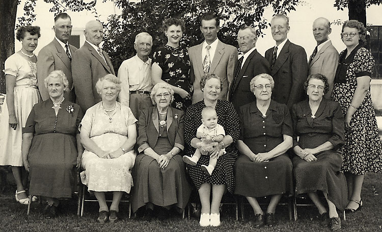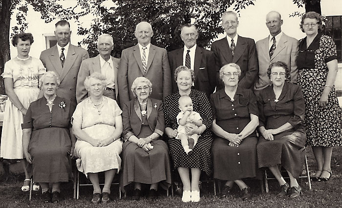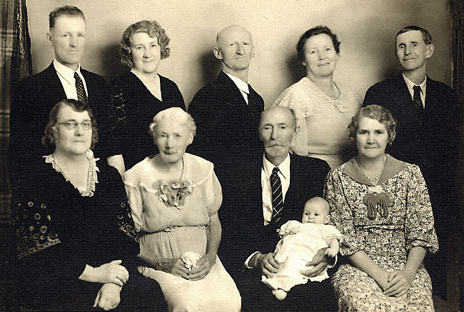 In the picture above are, Back Row: left to right: Bertha Billman Hill, Howard Hill, William LeRoy Johnson, Mortimer Billman, Bonnie Johnson Hill, Verdale Hill, John Spracher John Roland Durrant, Narvel Scott Johnson, Sadie Cleova Durrant Johnson. Front Row, left to right: Ann Bate Hill, Cora Bates Billman, Eliza Heiner Durrant, Lillian May Scott Johnson holding baby Ivan Hill, Julia Elizabeth Ross Radford Spracher, Sadie Geneva Radford Durrant.