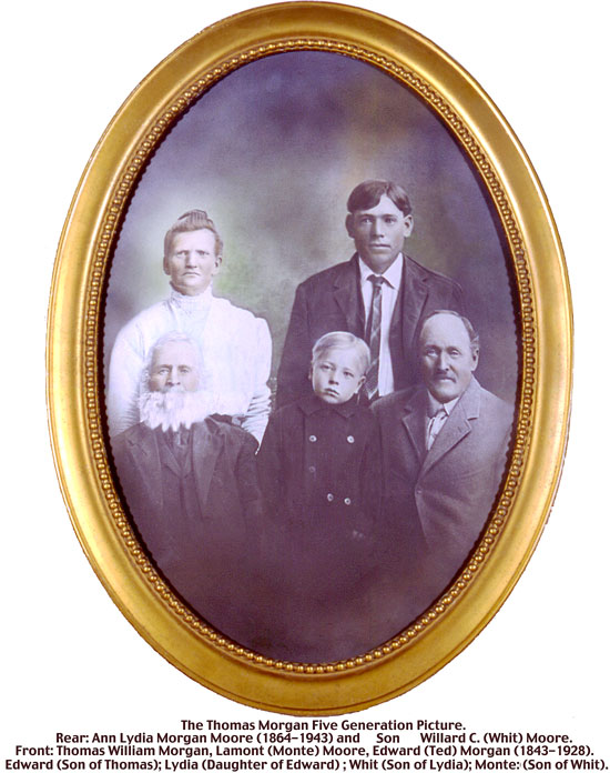 In the picture above is Thomas Morgan and one of his closest families; His oldest son Edward Morgan, Edward's oldest daughter Ann Lydia (Annie) Morgan Moore, Annie Lydia's oldest son Willard C. (Whit) Moore, and Willard's oldest son Lamont (Monte) Moore, representing five generations of Thomas Morgan's family. Thomas Morgan, Edward Morgan, and the Moore's are all buried together in the Shelton Cemetery in Idaho.