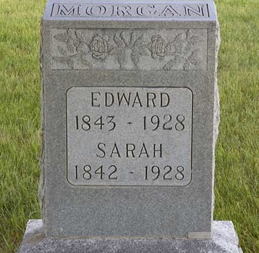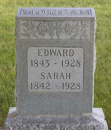 Below is a picture of Edward and Sarah Morgan's headstone in the Shelton Cemetery. Edward and Sarah Morgan are buried close by Edwards father and mother, Thomas and Ann Watkins Morgan.