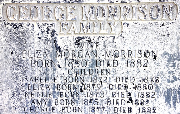 The year 1882 must have been incredibly difficult for George Morrison as his wife and the last three of his children all died. The children are believed to have died of diptheria but the cause of Eliza's death is not noted. They are all memorialized as "George Morrison Family" on one stone marker in the Oak City Cemetery. (Shown below)