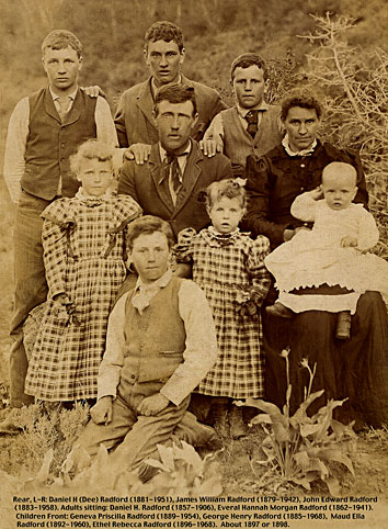 Daniel H. Radford was the sixth of seven children born to John Whitlock Radford and Leah Rachel Smith. He was born in Fillmore, Millard, Utah, 6 March, 1857. Daniel's sister, Nancy Jane Radford, married Thomas Morgan and his brother, John Franklin Radford, married Everal's sister Priscilla Morgan.