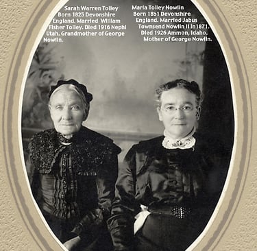On the right is Maria Tolley Nowlin. Born 1851 in Devonshire, England. Married Jabus Townsend Nowlin in 1871. Died 1926 in Ammon, Idaho. Mother of George Nowlin.
