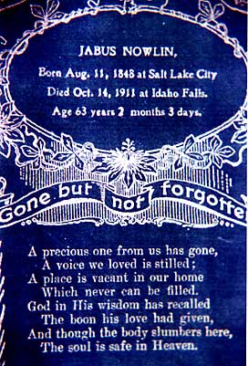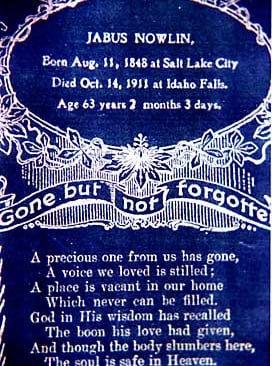 A funeral card handed out at the funeral of Jabus Nowlin, father of George Nowlin and husband of Maria Tolley.