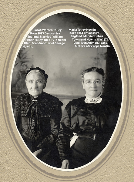 On the left is Sarah Warren Tolley, born 1825 in Devonshire, England. Married William Fisher Tolley. Died 1916 in Nephi, Utah. Grandmother of George Nowlin.
