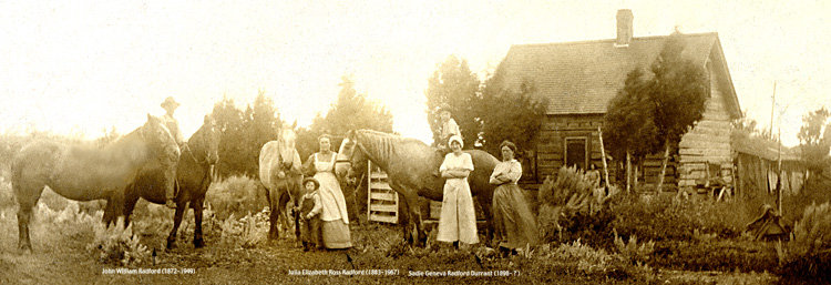 Written on the back of the picture above of John Radford's homestead. "Our old home. John is on old Bird and he is holding Fly's rope and I am standing between May and Baldy and Eldie is standing in front of me. I hold May and Baldie's ropes and Sadie is standing there by Baldy and May Comes is standing by Sadie and both have their arms folded. Bob Gourley is on Baldy's back." Written by Julia Elizabeth Ross Radford (standing between the two horses heads). The Eldie referred to, standing in front of Julia, is Eldie Brown.