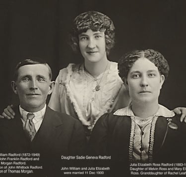 John William Radford was a son of John Franklin and Priscilla Morgan Radford, a grandson of John Whitlock and Rachel Leah (Ross) Radford and a grandson of Thomas Morgan.