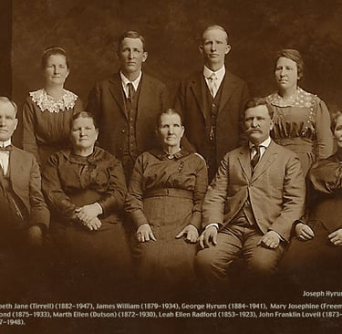 The Joseph Hyrum and Leah Ellen Radford Lovell family, shown in the picture above, probably accompanied the other families to Wyoming because Leah Ellen Radford was a daughter of John Whitlock Radford. Joseph Hyrum Lovell is not in the above picture because he died soon after the family arrived in Idaho and was deceased when the picture was taken.