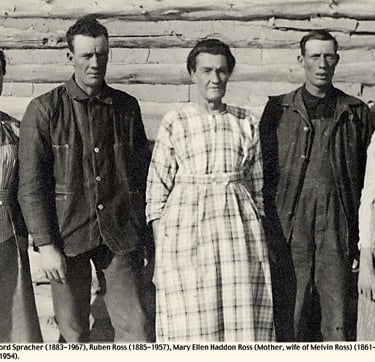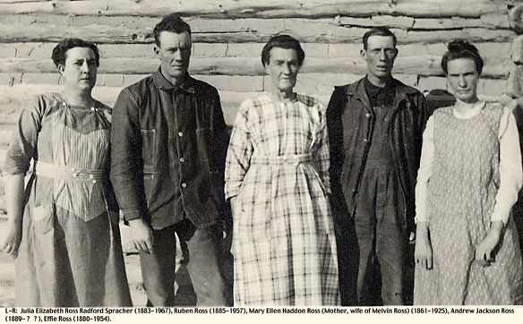 In the picture above are Melvin Ross's wife Mary Ellen Hadden and four of her children. Left to right they are Julia Elizabeth Ross Radford (1883-1967) (who married John William Radford), Ruben Ross (1885-1957) (who married Sarah Ann Hardy), Mary Ellen Hadden Ross (1861-1925)(Mother, who was married to Melvin Ross), Andrew Jackson Ross (1889-1950)(who married Maud Ella Radford), and the oldest daughter Effie Ross Workman (1880-1954) (who married Charles Samuel Workman).