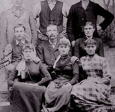 Back row, L-R: Francis Marion (Joe) Ross (1865-1949), Don Carlos Ross (1867-1918), James Melvin Ross (1869-1936). Center row: Silas Asael Ross (1875-1896). These four sons were all son's from Melvin's first marriage to Julia Elizabeth Smith Ross.