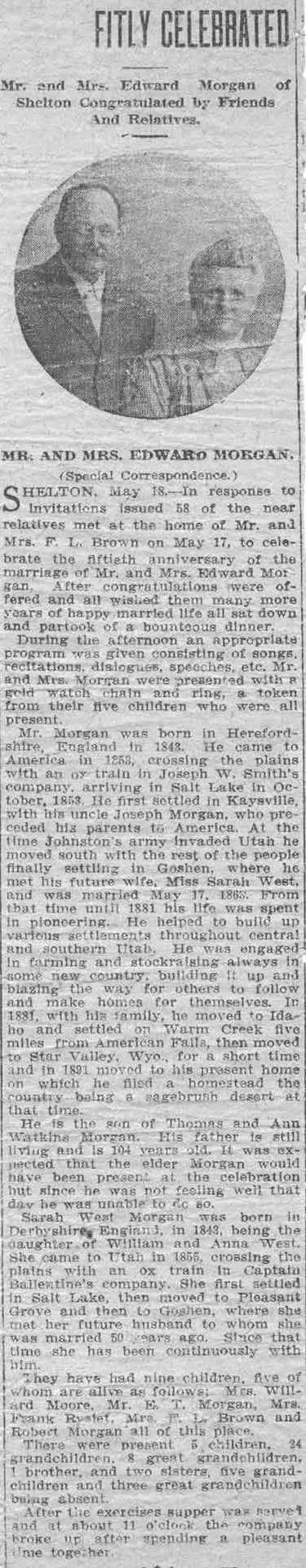 A newspaper clipping reporting the 50th wedding anniversity of Edward and Sarah West Morgan