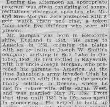 Some inaccuracies in the newspaper article need to be corrected. The wagon train that Thomas Morgan's son Edward and brother Joseph traveled in was commanded by Joseph W. Young (Not Joseph W. Smith). And Thomas Morgan was not 104 years old. See this website under Thomas Morgan for a life history of Thomas Morgan and an examination of his origins in Hereforeshire, which prove that he was not as old as the people thought he was in 1913.