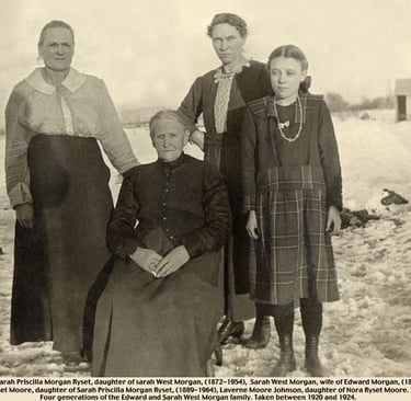 The Frank Ryset and Sarah Priscilla Morgan Ryset family stayed close to the Edward and Sarah West Morgan family and also to the Thomas Morgan families through all their lives. In the picture above are Sarah West Morgan, her daughter Sarah Priscilla Morgan Ryset, Sarah Priscilla's daughter Nora Ryset Moore, and Nora's daughter Laverne Moore Johnson.