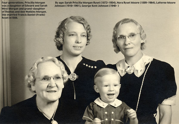 In the picture below are Sarah Priscilla Morgan Ryset with her oldest daughter Nora Ryset Moore, Nora's only daughter LaVerne Moore Johnson, and LaVerne's son George Kent Johnson.