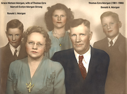 Front, left to right: Martha Grace Nielson Morgan (1903-1964), wife of Thomas Ezra Morgan, Thomas Ezra Morgan (1901-1986). Rear, left to right: Ronald, Marceil and Donald Morgan, adopted children of Thomas Ezra and Grace Morgan. Ezra and Martha were married 10 January 1923.