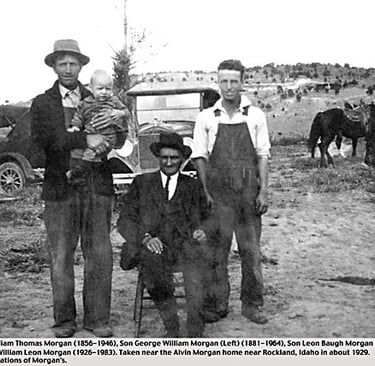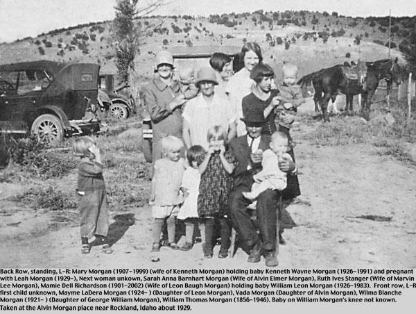 Emily Alice Baugh Morgan (Wife of George William) died 11 August 1929 in Blackfoot, Idaho and was buried in the Neeley cemetery. This picture, which was clearly a gathering of Morgan's at the Alvin Morgan home in Rockland, may have been taken at the time of or somewhere near the time of her death.