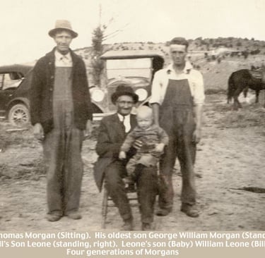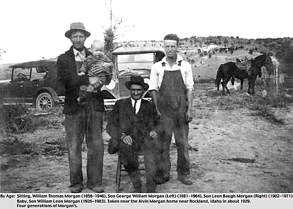 Present in this picture are William Thomas Morgan (1856-1946), his oldest son George William Morgan (1881-1964), George William's oldest son Leon Baugh Morgan (1902-1971) and Leon's oldest son William Leon Morgan (1926-1983).