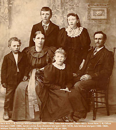 ABOVE....Back Row: George William Morgan (1881-1964), Julia Ann Morgan (1883-1957). Front Row: Clifton (Dick) Morgan (1889-1988), Sarah Lovina Ross (Holden) Morgan (1863-1919), Ada Melissa Morgan (1886-1968), William Thomas Morgan (1856-1946).